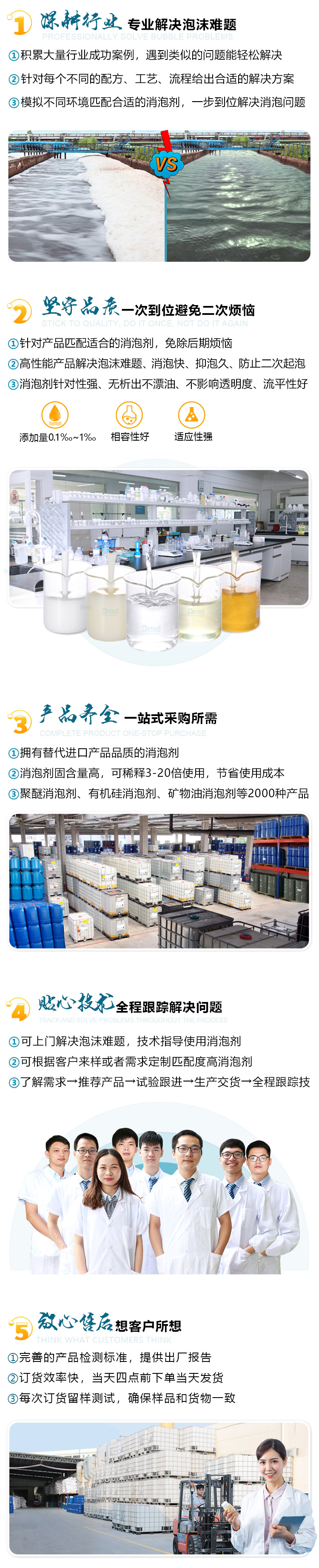 多年來公司面向市場,面向真實各行業客戶現場,對水處理消泡劑、工業消泡劑、有機硅消泡劑、發酵行業、清洗劑行業、金屬加工行業、造紙行業、建材行業、水性粘合劑行業、紡織印染行業、油田行業、水性涂料行業、印刷材料行業、電廠脫硫行業、工業清洗行業、家用化學品行業、采礦選礦工行業等32個行業工藝、流程及產品配方深入了解,對各行業消泡劑應用了如指掌,給能客戶提供合適的解決方案,所研發生產消泡劑適應客戶需求和市場需要,能輕松解決客戶遇到的難以解決的消泡難題,減少了客戶使用消泡劑的成本。公司依托完善的售前、售中及售后服務,全程技術跟進消泡劑的試樣到使用過程,節省了時間和成本,贏得了業界各類客戶們的贊譽!